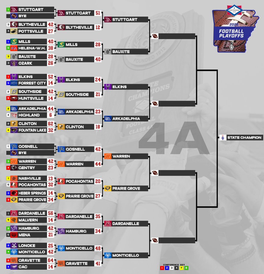 7-4A (3) Bauxite (9-3) at 8-4A (1) STUTTGART (11-0): Bauxite beat Mills by 12 points to advance to the quarterfinals for the first time since 2007. Freshman QB Wyatt Foreman (173 passing, 3 TDs; 17-110 rushing, 3 TDs) was the key on offense. Caden Metzker (21-152 rushing) and sophomore Gunnar Morris (5-49 rushing) led the ground game. Senior WR Cole Witherington (4-73-1 TD) led the receivers. Lane Hartwick (9 tackles, 1 sack), Mathyis Moore (7 tackles) and Morris (1 interception) played well on defense. Stuttgart returns to the quarterfinals for the first time since 2021 after beating Blytheville 51-12 last week.  Junior QB Cain Price (300 passing, 4 TDs; 1 rushing TD) targeted Caiden Sims (7-152 receiving, 2 TDs). Senior Keaton Byers threw a TD pass, caught a TD and returned a punt for a TD.