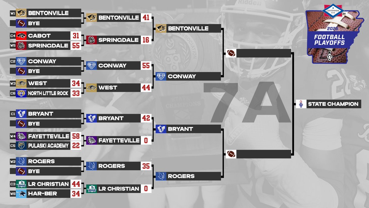 Central-2 No. 4 Conway (9-2, 6-1) at West-1 No. 2 BENTONVILLE (11-0, 7-0)